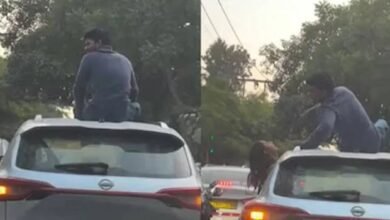 ഓടുന്ന കാറിന്റെ വിൻഡോയിലൂടെ സാഹസികമായി മുകളിൽ കയറി, പിന്നാലെ ചുംബനം; കേസെടുത്ത് മോട്ടോർ വാഹന വകുപ്പ്