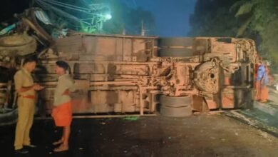 ബസ് മറിഞ്ഞത് നടുറോഡിൽ; പത്ത് പേർക്ക് പരിക്ക്, തൃശൂരിൽ ഗതാഗതം സ്തംഭിച്ചു