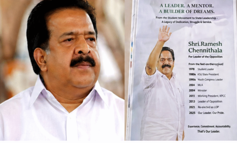 തിരുവനന്തപുരം: മുഖ്യമന്ത്രി സ്ഥാനാർഥിത്വവുമായി ബന്ധപ്പെട്ട പരസ്യപ്രസ്താവനകൾക്കും അവകാശവാദങ്ങൾക്കും കെപിസിസി കർശന വിലക്കേർപ്പെടുത്തിയതിന് പിന്നാലെ കോൺഗ്രസിനുള്ളിലെ ഗ്രൂപ്പ് പോർ പുതിയ വഴിത്തിരിവിലേക്ക്. മുതിർന്ന നേതാവ് രമേശ് ചെന്നിത്തലയെ പിന്തുണച്ച് ഒരു പ്രമുഖ ഇംഗ്ലീഷ് ദിനപത്രത്തിൽ മുഴുവൻ പേജ് പരസ്യം പ്രത്യക്ഷപ്പെട്ടതാണ് പുതിയ വിവാദങ്ങൾക്ക് വഴിവെച്ചത്.തിരുവനന്തപുരം ഡിസിസി ജനറൽ സെക്രട്ടറിയാണ് പരസ്യ നൽകിയിരിക്കുന്നത് എന്നാണ് പുറത്തു വരുന്ന വിവരം. വിദ്യാർത്ഥി രാഷ്ട്രീയ കാലഘട്ടം മുതൽ ഇന്നുവരെ നീളുന്ന രാഷ്ട്രീയ ജീവിതവും കോൺഗ്രസിനോടുള്ള സംഭാവനകളും വിശദമായി ചർച്ച ചെയ്യുന്ന രീതിയിലാണ് പരസ്യം തയ്യാറാക്കിയിരിക്കുന്നത്. കെഎസ്യു പ്രവർത്തകനായിരുന്ന കാലത്ത് സൈക്കിളിൽ സഞ്ചരിച്ച് സംഘടന വളർത്തിയെടുത്തത് ഉൾപ്പെടെ അദ്ദേഹത്തിന്റെ രാഷ്ട്രീയ യാത്രയിലെ വിവിധ ഘട്ടങ്ങൾ പരസ്യത്തിൽ ഉൾപ്പെടുത്തിയിട്ടുണ്ട്. “ഞങ്ങളാരും സുപ്രഭാതത്തിൽ പൊട്ടിമുളച്ചവരല്ല” എന്ന അദ്ദേഹത്തിന്റെ പ്രസ്താവനയും പ്രധാനമായി ഉദ്ധരിച്ചിട്ടുണ്ട്.ഇതിനുമുമ്പ് പ്രതിപക്ഷ നേതാവ് വി . ഡി സതീശനെ ഭാവി മുഖ്യമന്ത്രിയായി ഉയർത്തിക്കാട്ടി സോഷ്യൽ മീഡിയകളിൽ വ്യാപകമായി പ്രചാരണങ്ങൾ നടന്നിരുന്നു. ഇതിനെ തുടർന്നാണ് ഹൈക്കമാൻഡ് നിർദേശപ്രകാരം കെപിസിസി പൊതുപ്രസ്താവനകൾക്കും പ്രചാരണങ്ങൾക്കും വിലക്കേർപ്പെടുത്തിയത്.എന്നാൽ പുതിയ സംഭവവികാസങ്ങൾ പാർട്ടിയുടെ അടിത്തട്ടിലുള്ള പ്രവർത്തകരിൽ വിലക്കുകൾക്ക് വലിയ സ്വാധീനമില്ലെന്ന സൂചന നൽകുന്നു. വാക്കാലുള്ള പ്രസ്താവനകൾക്ക് നിയന്ത്രണം ഏർപ്പെടുത്തിയ സാഹചര്യത്തിൽ പത്രപ്പരസ്യം പോലുള്ള മാർഗങ്ങൾ വഴി പിന്തുണ പ്രകടിപ്പിക്കുന്നതാണ് ഇപ്പോൾ കാണുന്നത്.പാർട്ടി നേതൃത്വങ്ങൾ ഐക്യത്തിന് പ്രാധാന്യം നൽകുന്ന സമയത്ത് ഇത്തരം നീക്കങ്ങൾ കോൺഗ്രസിനുള്ളിലെ ഗ്രൂപ്പ് സമവാക്യങ്ങൾ ശക്തമാണെന്നതിന്റെ തെളിവായാണ് വിലയിരുത്തപ്പെടുന്നത്. തെരഞ്ഞെടുപ്പുകൾ അടുത്തുവരുന്ന സാഹചര്യത്തിൽ ഇത്തരം ആഭ്യന്തര വടംവലികൾ മുന്നണിയുടെ ഏകോപനത്തെ എങ്ങനെ ബാധിക്കുമെന്നതാണ് രാഷ്ട്രീയ നിരീക്ഷകരുടെ പ്രധാന ചർച്ചാവിഷയം.അതേസമയം, ഇത്തരം പരസ്യപ്രകടനങ്ങൾ അച്ചടക്കലംഘനമായി കാണുമോ എന്നതിൽ പാർട്ടി നേതൃത്വം ഇതുവരെ ഔദ്യോഗികമായി പ്രതികരിച്ചിട്ടില്ല.