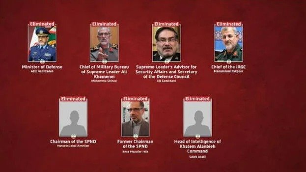 ഇറാനിലെ മുതിർന്ന പ്രതിരോധ ഉദ്യോഗസ്ഥനും സുരക്ഷാ ഉപദേശകനുമായ അലി ഷംഖാനി, ഇസ്ലാമിക് റെവല്യൂഷണറി ഗാർഡ് കോർപ്സ് കമാൻഡർ മുഹമ്മദ് പാക്പുർ, പ്രതിരോധ മന്ത്രി അസീസ് നസീർസാദ തുടങ്ങിയ ബുദ്ധികേന്ദ്രങ്ങളെ വധിച്ചെന്നാണ് ഐഡിഎഫ് അറിയിച്ചത്.