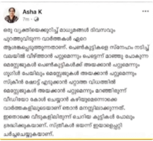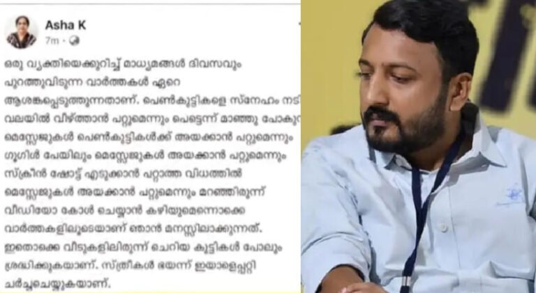 രാഹുല് മാങ്കൂട്ടത്തിലിനെതിരെ കെ സി വേണുഗോപാലിന്റെ ഭാര്യ ആശ കെ പങ്കുവെച്ച ഫേസ്ബുക്ക് പോസ്റ്റ് രാഹുല് അനുകൂലികളുടെ കൂട്ടമായ സൈബര് ആക്രമണത്തെ തുടര്ന്ന് പിൻവലിച്ചു. പെണ്കുട്ടികളെ സ്ന്ഹേം നടിച്ച് വലയില് വീഴ്ത്തുന്ന ഇയാളെ പറ്റി പുറത്തുവരുന്ന വാര്ത്തകള് ആശങ്ക സൃഷ്ടിക്കുന്നതാണെന്നും സ്ത്രീകള് ഭയന്നാണ് ഇയാളെ പറ്റി ചര്ച്ച ചെയ്യുന്നതെന്നും. ഒന്നും പറയാതെ മിണ്ടാതിരിക്കാൻ സാധിക്കുന്നില്ലെന്നുമാണ് ആശ ഫേസ്ബുക്കില് കുറിച്ചത്.