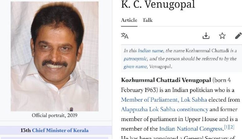 കെ സി വേണുഗോപാലിന്റെ വിക്കി പേജിൽ പതിമൂന്നാമത് മുഖ്യമന്ത്രിയെന്ന് മാറ്റം