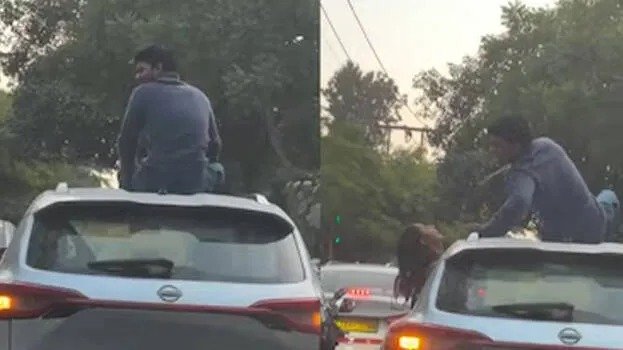 ഓടുന്ന കാറിന്റെ വിൻഡോയിലൂടെ സാഹസികമായി മുകളിൽ കയറി, പിന്നാലെ ചുംബനം; കേസെടുത്ത് മോട്ടോർ വാഹന വകുപ്പ്