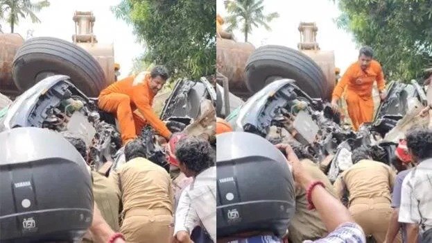 അഗ്നിശമന സേനയും പൊലീസും നാട്ടുകാരും ചേർന്ന് കാർ വെട്ടിപ്പൊളിച്ചാണ് യാത്രക്കാരെ പുറത്തെടുത്ത് ആശുപത്രിയിൽ എത്തിച്ചത്. ലോറിയുടെ ടയർ പൊട്ടിയതാണ് അപകടത്തിന് കാരണമെന്നും നാട്ടുകാർ പറയുന്നു. ബെെക്ക് യാത്രികനാണ് മരിച്ചതെന്നാണ് റിപ്പോർട്ട്. ഒപ്പമുണ്ടായിരുന്ന സ്ത്രീയെ അതിഗുരുതര പരിക്കുകളോടെ മെഡിക്കൽ കോളേജ് ആശുപത്രിയിൽ പ്രവേശിപ്പിച്ചു. കൂടുതൽ വിവരങ്ങൾ ലഭിച്ചിട്ടില്ല.