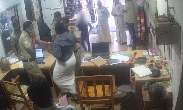 കൊല്ലം: ചവറ പൊലീസ് സ്റ്റേഷനിലും പൊലീസിന്റെ ക്രൂരത. പരാതിക്കാരനായ സിപിഐഎം പ്രവർത്തകനെ ഏഴാം ക്ലാസുകാരനായ മകന്‍റെ മുന്നിൽ വെച്ച് പൊലീസ് അസഭ്യം പറയുകയും പിടിച്ച് തള്ളുകയും ചെയ്യുന്നതിന്റെ സിസിടിവി ദൃശ്യങ്ങൾ റിപ്പോർട്ടറിന് ലഭിച്ചു. ചവറ സ്വദേശി അഡ്വക്കറ്റ് ക്ലർക്കായ ബേബിയോടാണ് വിമൽകുമാർ എന്ന പൊലീസുകാരന്‍റെ ക്രൂരത. ഏഴാം ക്ലാസുകാരന് മറ്റൊരു കുട്ടി അശ്ലീല വീഡിയോ കാണിച്ച് കൊടുത്തെന്ന പരാതിയിലാണ് ചർച്ചയ്ക്കായി വിളിച്ചു വരുത്തിയത്.