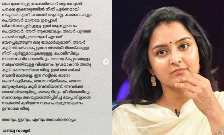 കുറ്റം ആസൂത്രണം ചെയ്തവർ പകൽവെളിച്ചത്തിലുണ്ട്, അന്നും ഇന്നും എന്നും അവൾക്കൊപ്പം’; മഞ്ജു വാര്യർ